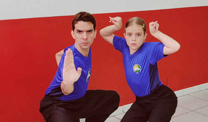 Eu sou o Victor, tenho 29 anos e pratico Kung Fu desde os 15 (sim, já é quase metade do meu tempo de vida, viu?) e essa do meu lado é a Ana Luiza, ou só Ana, ou Aninha - ela tem apenas 10, mas já tá voando alto e é atleta desde seus 6 anos!!