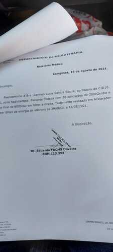 (Comprovante das sessões de radioterapia realizadas em 2021 em dona Cármen, caracterizando as viagens realizadas diariamente durante 6 semanas por seu marido).