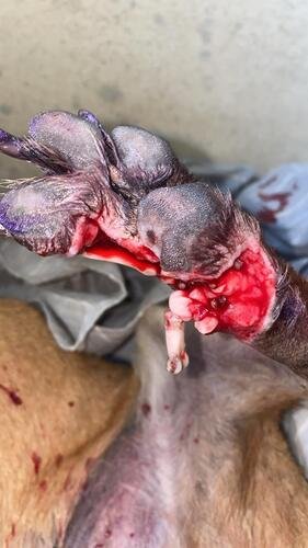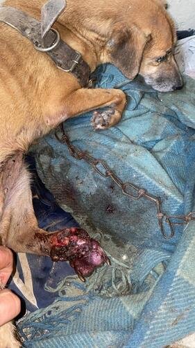VAKINHA URGENTE!! Essa cadelinha idosa invadiu minha construção em um lugar rural dia 03/11 na noite de muita chuva, estava com a pata com muita bicheira, ela é idosinha, muito magra e provavelmente com a doença do carrapato, na manhã seguinte dei remédio para matar os bichos e antibiótico, enquanto isso tentei de todas as formas ajuda financeira ou resgate, estou com câncer e fazendo quimioterapia, com a imunidade baixa nem poderia estar fazendo isso, ontem deu bicho de novo e comeu mais a pata dela, foi feito um orçamento da cirurgia fica em mais de 790,00 fora o tratamento pós operatório, peço ajuda urgente, pois ela não aguentará mais ficar com os ossos expostos e infecção, toda ajuda será prestado contas, os vídeos do antes, durante e depois da recuperação