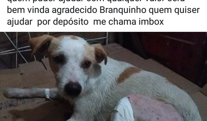 O branquinho e é um cachorrinho de rua que foi atropelado e quebrou as duas patinhas traseiras . Precisou passar por uma cirurgia na clínica do Dr Paulo Sampaio
