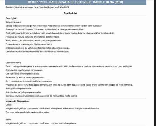 Ela tinha uma ferida aberta na pata anterior direita e não conseguia movimentar as patas traseiras. Os exames de imagens constataram duas fraturas, uma na pata da frente e outra na pelve. O ultrassom dos órgãos internos não constatou nenhuma alteração.