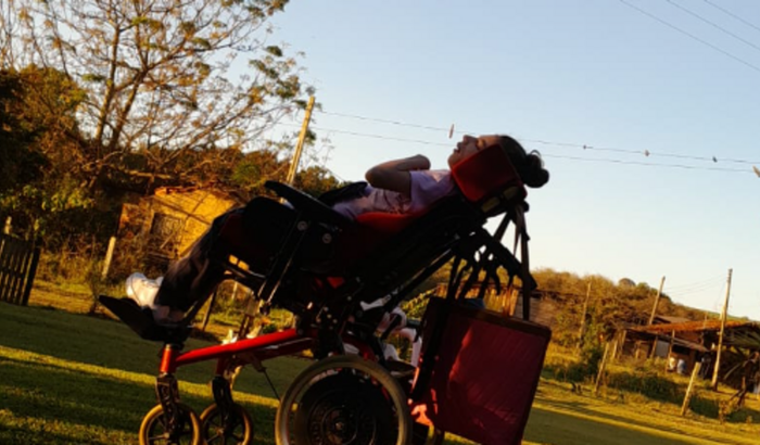 Há 2 anos o benefício do LOAS que nos ajudava financeiramente foi cortado, e só meu esposo trabalha, pois com os cuidados que a Camila precisa, fica difícil eu trabalhar fora, quando dá certo faço alguns bicos, e infelizmente não temos condições de arcar com os custos de uma nova cadeira no momento.
