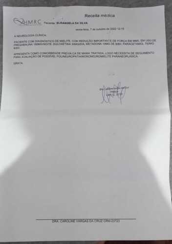 No final do mês de julho comecei a sentir fortes dores na região da perna direita que irradiava para o cóccix ,então procurei hospital ,ia de 3 a 4 x na semana pra ser medicada por não aguentar tanta dor ,entre exames e remédios e nada até então descoberto, no dia 1 de setembro fui internada no Hospital Santo Antônio aqui em Itapema, já com muita dificuldades para andar ,no dia seguinte transferida para Balneário Camboriú no hospital Ruth Cardoso já sem conseguir movimentar os membros inferiores onde permaneci 35 dias internada sob observação médica ,fiz diversos exames específicos até descobrirem o motivo da minha paralisia.