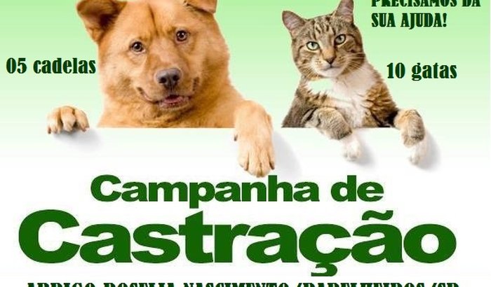 Amigos, mais uma vez venho pedir a ajuda de vocês! Em meu abrigo, todos os meus animais são castrados, o problema é que a cada dia jogam ninhadas de filhotes em minha porta ou as trazem por estarem “descartadas” por aí e como sou protetora todos acham que tenho obrigação em recolher, mas infelizmente ninguém nos ajuda a castrar e alimentar, resultado de todo este descaso, precisamos urgente, pra ontem, castrar 10 gatas e 5 cadelas pois muitas estão no cio e não quero aplicar vacina, os machos ficarão para depois. Infelizmente não tenho nem como alimentar esta turma, quanto mais castrar, ou ainda se se multiplicarem o que serão deles e de mim? Por isso estamos iniciando esta campanha antes de que a situação piore. Não temos como fazer gratuito pela prefeitura pois o meu CPF e de minhas colaboradoras já estão esgotados, mas caso alguém se dispuser a nos emprestar seu CPF para cadastro junto à prefeitura e nos acompanhar em todas as etapa necessárias, aceitamos. Conseguimos em uma clinica aqui perto (o que nos ajuda uma vez que não temos transporte) que abriu agora, castrações a preços populares, GATA R$ 70,00 e (qualquer peso) R$ 150,00, mesmo assim IMPOSSÍVEL para nós, por isso pedimos a quem possa nos ajudar, seja colaborando com uma ou meia, etc. Você que adora animais, mais não tem como recolhê-los pode nos dar esta forcinha e nos ajudar a ter menos animais abandonados por ai? Obrigada! Roselia CLINICA EM QUE SERÃO REALIZADAS: HOVEP – Hospital Veterinário Popular Rua Henrique Roschel Christi, 900 – Jd. Dos Álamos Fone: 5926-0505