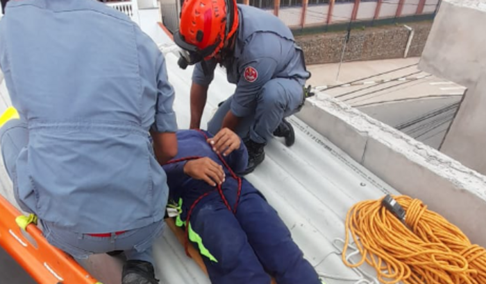 Caindo para frente batendo seu rosto na beira do muro do lugar onde estava. Quase perdendo sua vida na beira de um telhado a mais 8 metros do chão!