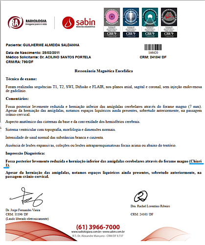 No dia 10 de janeiro recebemos um email com o resultado. Os médicos ao analisarem as imagens confirmaram o Chiari tipo 1 e descobriram outras patologias correlacionadas à Sindrome não detectadas aqui em Brasília e que agravam o caso. Uma delas é a SIRINGOMIELIA que também é degenerativa e mais incapacitante. Ou seja, se era urgente, tornou-se URGENTÍSSIMO.