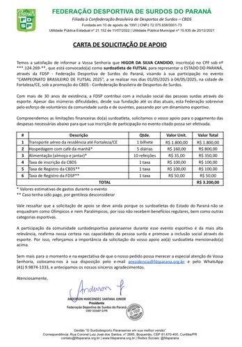 *Ajudem Higor a representar o Paraná no Campeonato Brasileiro de Futsal*A Confederação Brasileira de Futsal - CBDS convocou a atleta Higor de Associação de Surdos de Curitiba - CURITIBA para participarem de jogos e campeonatos que acontecerão em Fortaleza - CE no mês de Maio de 2025, dos dias 01/05 até 04/05. Essa atleta têm um grande sonho nesta representação do Paraná como também na representação da CURITIBA. A dedicação de ambas é admirável!!! São muito esforçadas!!Para que este sonho e esta grande oportunidade se realize, precisamos de sua doação, seja ele de qualquer valor.As doações serão utilizadas nas despesas da viagem, incluindo passagem aérea, transporte, hotel, alimentação e as taxas referente a participação de cada uma nos campeonatos.Ao total, as despesas de *cada uma* soma-se R$ 3.200,00.
