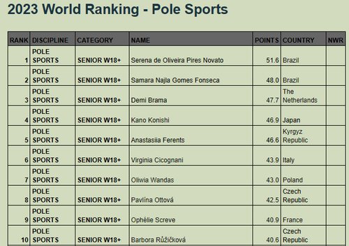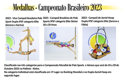 No ano de 2022 conquistei 2º Lugar Pole Sports Duplas e 3º Lugar na Lirá Acrobática Duplas e 3º lugar no Pole Sport individual 18+ no Campeonato Mundial que foi realizado na Suíça em Lausanne.