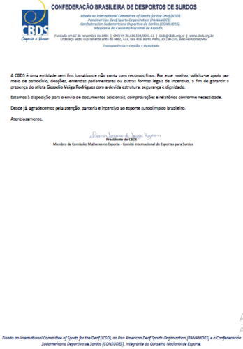 A CBDS é uma entidade sem fins lucrativos e não conta com recursos fixos. Por esse motivo, solicita-se apoio pormeio de patrocínio, doações, emendas parlamentares ou outras formas legais de incentivo, a fim de garantir apresença do atleta Gessélio Veiga Rodrigues com a devida estrutura, segurança e dignidade.Estamos à disposição para o envio de documentos adicionais, comprovações e relatórios conforme necessidade.Desde já, agradecemos pela atenção, parceria e incentivo ao esporte surdolímpico brasileiro.Atenciosamente,