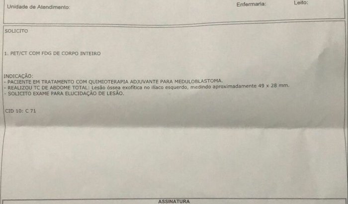 Olá. Meu nome é Luan, tenho 20 anos e em Agosto de 2022 fui diagnosticado com uma neoplasia no cerebelo. Fiz a cirurgia, e foi um sucesso, porém, pela demora da rede pública não consegui iniciar o tratamento rápido, e por ser um tumor maligno, agressivo, em 3 meses voltou, com metastases em outros lugares da cabeça e coluna. Ocasionando em paralisia dos membros inferiores. Atualmente estou no 5 ciclo da quimioterapia. Dia 20/09/2023 fui para um retorno de rotina, onde descobrir uma infecção, e fui levado ao pronto socorro pra fazer tomografia do abdômen e tórax. Lá acabamos descobrindo um nódulo no pulmão e uma lesão óssea no iliaco esquerdo. Agora estamos precisando fazer um exame de PET/CT para saber quais serão os próximos passos. O exame ficou no valor de R$3.680. Peço a ajuda de vocês pra conseguir fazer este exame de muita importância, pra dar continuidade no meu tratamento com fé em Deus.