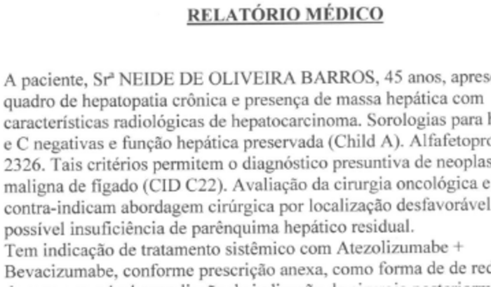 Olá tudo bem ? Me chamo Neide e venho através dessa vakinha conta um pouco da minha história nesse momento tão difícil que estou enfrentando , no dia 24/03 de março sentir fortes dores o que me fez procurar um atendimento médico, e entre idas e vindas médico pediu que eu fizesse alguns exames para saber o que de fato eu estava tendo , e infelizmente veio a pior notícia que poderia receber descobri que estava com um câncer no fígado e os médicos pediram mais exames e infelizmente veio outra notícia ruim o câncer era maligno ,então pensei vou começar o tratamento é tudo ficará bem e o médico veio novamente com outra notícia que para o tratamento precisaria de um remédio que infelizmente o sus não pôde fornecer que custará para um tratamento de 3 meses o valor total de 150 mil reais, e com isso venho aqui pedir que quem puder ajudar com qualquer valor e quem não poder ajudar e poder compartilhar a vakinha também me ajudará muito pois preciso dessa medicação para salvar a Minha Vida, qualquer valor será bem vindo e estou com muito esperança que vou conseguir.