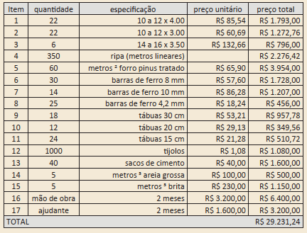 Agora a proposta é realizar um financiamento coletivo para construir uma nova casa, reutilizando todo o material que esteja em boas condições da antiga casa. As etapas de construção contarão com mutirões de amigos e apoiadores. Os materiais e outros custos envolvidos na obra estão disponibilizados no quadro abaixo e foram cotados nas empresas da região no ano de 2021.