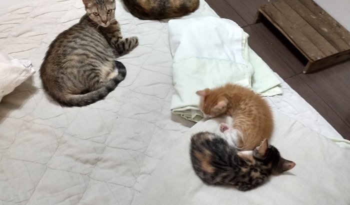 A Pedra é uma das gurias para serem castradas, ela estava abandonada e tem suas duas filhas: a Leona e a Mentira. Bibi, que esta de costas, já é castrada e agradece se não houver mais filhotes e abandono. Ela está de costas.