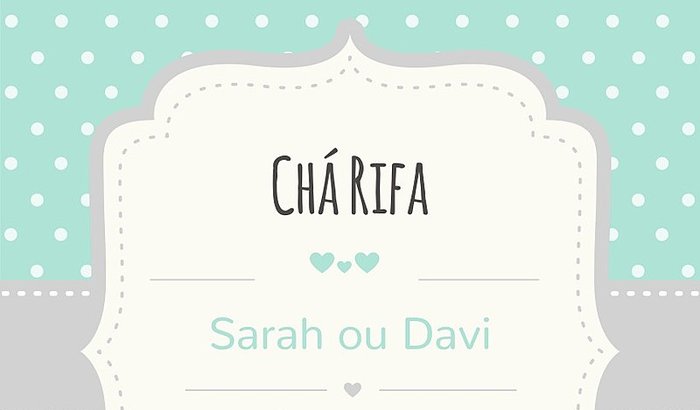 A mamãe e papai ainda não descobriram se sou Davi ou Sarah, esse segredo será revelado no dia do meu chá revelação. O meu chá rifa vai funcionar assim... Cada contribuição (nome) vale um pacote de fralda e você concorre a uma linda cesta de café da manhã com chocolates que será sorteado dia 12/03 as 20horas nas redes sociais da mamãe (instagram e Facebook) você não pode ficar fora dessa... Chama a mamãe ou o papai que eles explicam TD direitinho... Eu a mamãe e o papai contamos com você... Boa sorte Beijos Davi ou Sarah
