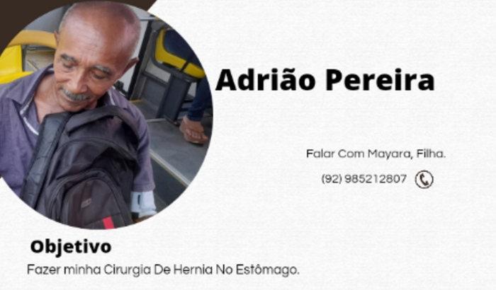 Meu pai está com uma hérnia dentro do estômago, vem sentindo dores na barriga, gases, dificuldade pra comer. Precisamos do dinheiro pra pagar a cirurgia para remover a hérnia, ela está grande e dentro do estômago , ele tem 67 anos é pedreiro , mas sempre trabalhou em diárias , nunca trabalhou de carteira assinada, não temos condições pra custear a cirurgia! Precisamos da sua ajuda,conto com sua colaboração . Obrigada !