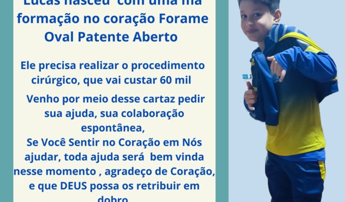 Recentemente foi diagnosticado com uma má formação no coração, forame oval patente aberto, ele tem 17 milímetros no coração, o lado direito está maior que o esquerdo, precisa passar por o procedimento cirúrgico, e desde já agradeço a todos que colaboraram de todo meu coração e que Deus possa retribuir em dobro
