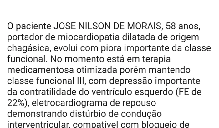 Em 18/08/2023 ele sofreu um AVC e após pagar uma consulta particular com um especialista cardíaco, foi nos informado que o coração não estava trabalhando direito, por isso foi enviado um líquido para o cérebro que resultou no AVC, e era necessária a colocação de um aparelho chamado CDI em caso de urgência.