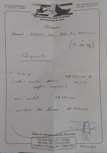 Oi, pessoal! Nossa querida cachorrinha Estela está enfrentando um momento difícil. Ela foi diagnosticada com dois tumores nas mamas e precisa de uma cirurgia urgente. Já gastamos: