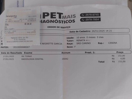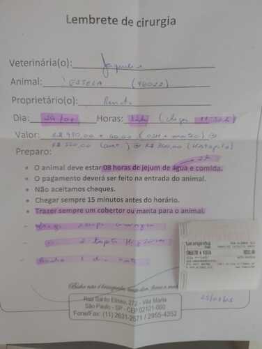 R$580,00 com consultas e exames pré operatórios;R$144,00 com exames raio x torax;R$53,00 com materiais e medicamentos pré-operatórios solicitados pela clínica.
