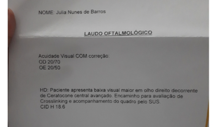 Olá, eu sou Júlia, tenho 19 anos, recentemente fui diagnosticada com uma doença nos olhos chamada ceratocone, não tem cura mas há uma cirurgia que custa 10.000 reais. Eu já perdi cinquenta por cento da visão e com essa cirurgia eu não vou recupera-la mas vai fazer a doença parar de avançar e me impedir de chegar a cegueira. Qualquer quantia já me ajuda. Obrigada desde já!