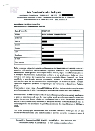 Olá! Meu nome é Luiza, tenho 25 anos e acabei de me formar na faculdade. Tenho uma doença genética e rara chamada neurofibromatose espinhal tipo 1. Em outubro de 2025 fiz uma ressonância que revelou um tumor na coluna com altas chances de ser um tumor maligno - ou próximo a isso.