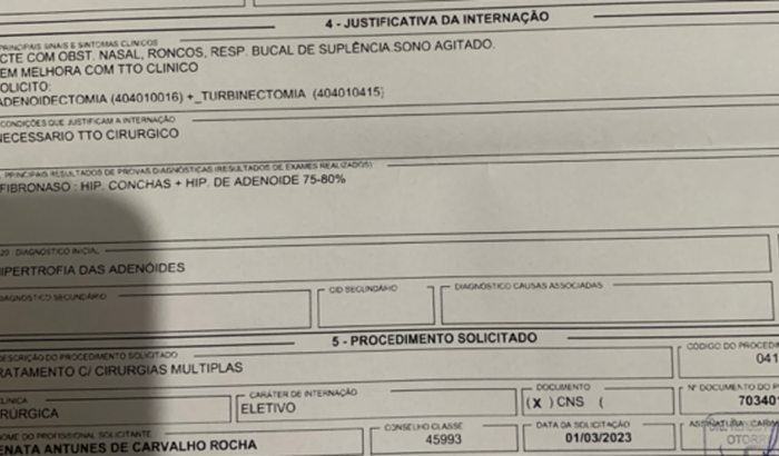 Manuela Helena Faria de Barcellos, é uma criança de 5 anos. Manu faz tratamento com fonoaudióloga desde os 3 anos de idade devido ao atraso de fala, não forma frases e não consegui pronunciar palavras com dicção claro , oque dificulta o aprendizado na escola e nós como família a entender oque ela diz. Além do atraso de fala, ela tem 80% da respiração tomada pelas adenoides, oque faz ela roncar e ter o sono agitado, quando gripa ou sinusite ataca demora semanas para melhorar. Segundo a otorrinolaringologista as adenoides estão muito grande onde um dos lados está começando a alterar parte da audição, oque dificulta ainda mais a fala.