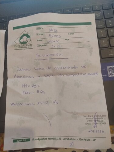 Olá, me chamo Fabiana e Carla é minha sobrinha e estamos realizando esta vaquinha para pedir ajuda com o tratamento da nossa cachorrinha Mel. Ela precisa passar por uma cirurgia para retirada de um tumor na mama, que já está aberto e apresenta risco de infecção. A cirurgia foi agendada pelo hospital público para o dia 15/12, porém, ela está com anemia e precisa receber uma bolsa de sangue antes do procedimento, que infelizmente não é fornecida pelo governo.