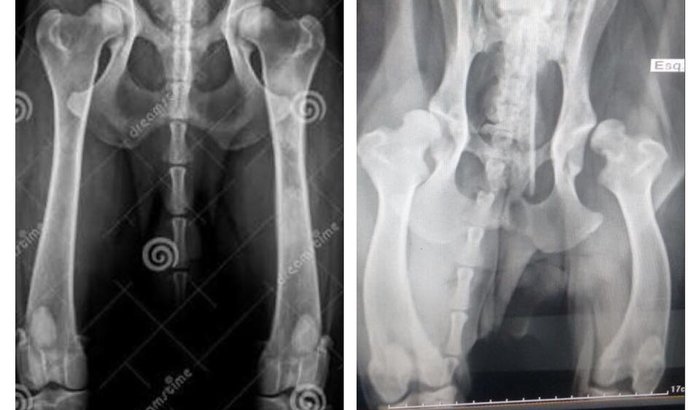 Coloquei a imagem de uma radiografia normal de um cãozinho que achei na internet e a radiografia de Bono (à direita) para vocês observarem como está tudo fora do lugar..