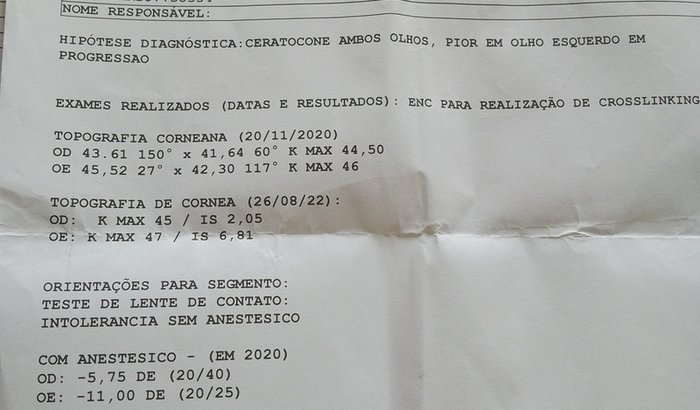 Tenho uma doença nos olhos , chamada ceratocone,na qual os últimos anos vem vindo progredindo muito rápido, estou na espera do SUS desde 2020, e nada acontece, eu não tenho condições de pagar pelo tratamento. A cirurgia de crossling e uma cirurgia que ajuda a doença a não avançar ainda mais. E parar no estado que ela se encontra,ainda tem os exames pra pagar, os colírios pós operatório, passagens de ônibus até a clínica, alimentação,eu preciso muito de ajuda ,e no final de tudo ainda ,se o crossling não for totalmente suficiente pra ajudar ,e preciso colocar lentes de contato que não são baratas.. peço que me ajudem por favor . obrigada