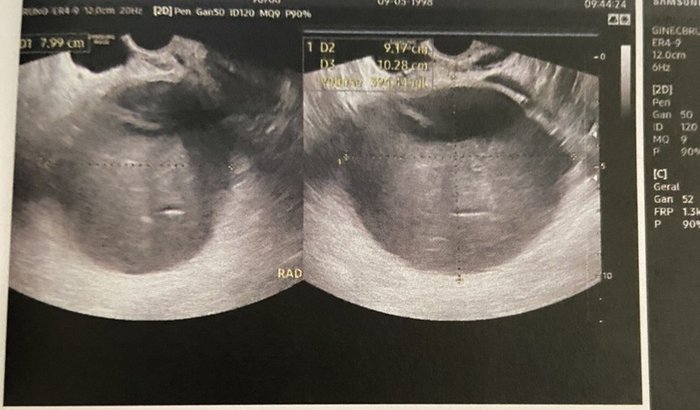 Oi. Eu sou a Duda. Recentemente eu senti muitas dores na parte inferior da barriga ao lado direto. Depois de alguns exames foi encontrado um cisto de 10cm no meu ovário, de característica hemorrágica. De acordo com a médica que me atendeu esse cisto não