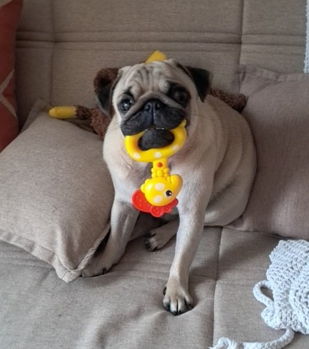 Parafina, nosso Pug mais novo (1 ano e meio), nosso filho de 4 patas começou a ter convulsões sem motivos aparentes, fizemos todos os exames investigativos (ultrassom abdominal, exames de sangue, coleta de liquor da espinha, eletrocardiograma e tomografia) e foi constatado HIDROCEFALIA.