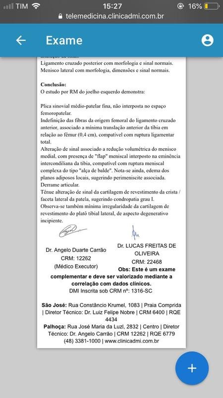 Há alguns anos, em uma atividade esportiva, vim a romper meu LCA (ligamento cruzado anterior) parcialmente. Nesse caso, não foi preciso fazer cirurgia, apenas fortalecimento. Porém, há uns 3 meses atrás, numa atividade recreativa com o pessoal da AV, vim a me machucar. Fiquei 2 meses sem fazer ressonância, nem nada, achando que seria o mesmo caso da primeira vez. Mês passado, então, tomei a iniciativa e fui fazer a ressonância em florianópolis onde conseguimos convênio e saiu por 300 reais (este exame é em cerca de 500 a 1000 reais). Então, foi constatado que eu tinha ruputra ligamentar total do LCA e também do menisco. Também foram enxergados outros problemas que serão feitos na cirurgia, como problemas no fêmur e tendões da coxa.