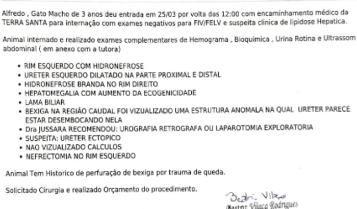 Alfredo esta com lipídose hepática e precisa retirar o rim esquerdo, para que possa ter chance de sobrevivência. Por isso conto com qualquer colaboração que possa me ajudar nesse momento tão difícil.