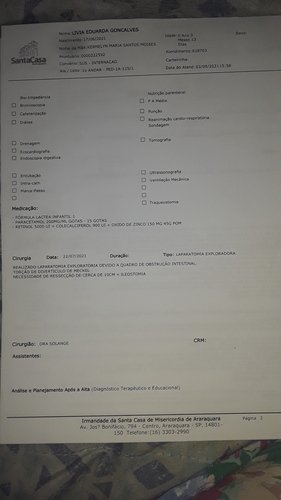 Lívia é uma bebê de 7 meses ostomizada,com 2 meses de vida no dia 22/08/2021 passou por uma cirurgia de emergência na Santa Casa de Araraquara Sp,onde minha filha foi diagnosticada com uma doença congênita,chamada DIVERTICULO DE MEKEL,onde ocasionou uma torção no intestino, junto de uma hernia interna. Foi retirado um pedaço do intestino dela e foi feito uma ileostomia para sua recuperação,o tempo de espera para uma nova cirurgia seria de 6 meses porém o SUS tem uma fila de espera de 2 anos,eu e minha esposa fomos atras para realização dessa cirurgia no particular o mais rapido possível pois o estoma da minha filha é retraido e por ser uma ileostomia sai muito ácido,isso queima,corrói todaa pele dela da barriguinha,minha filha nao dorme direito,chora muito pela dor que isso causa,minha esposa faz os cuidados da pele dela varias e varias vezes ao dia,minha filha usa uma pomada chamada ILEX que custa de 500 a 700 reais só vende pelo MercadoLivre,Lívia toma um leite especial que custa 128 reais, gastamos em fraldas varios e varios pacotes pelas trocas ser constante,.inumeras gaze,pomadas de assaduras enfim é uma luta.