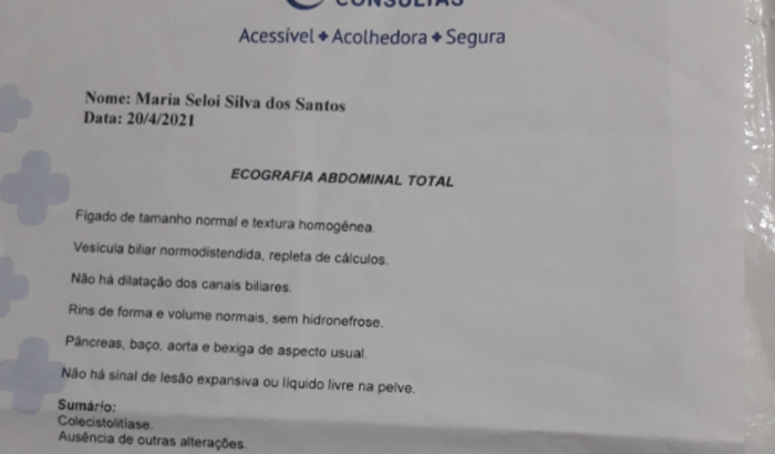 Saudações: venho através desse meio de comunicação pra pedir ajuda, pois tive várias crises de muitas dores e fui ao médico e ele me pediu exames, fiz e foi constatado minha vesícula repleto de cálculo e preciso fazer uma cirurgia, continuo tendo muitas crises e tenho muitas noites mal dormida por causa da dor, estou trabalhando e recebo um salário que não é suficiente pra pagar a cirurgia, porque tenho dois filhos pra sustentar e o meu marido está desempregado!!