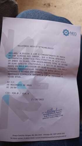 Estou criando essa vaquinha para ajudar a minha tia Maria Helena a realizar um procedimento cirúrgico em caráter de urgência. Ela tem retinopatia diabética proliferativa de alto risco em ambos os olhos, com deslocamento total de retina em olho direito, o qual já perdeu a visão e por isso é inoperável. Para não perder completamente a visão, o médico solicitou cirurgia com o máximo de urgência ( máximo de 2 meses) e paleativos com fotocoagulação a laser.