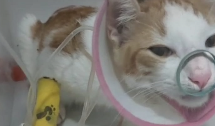 Hoje (16/03), ele teve que fazer uma cirurgia para remover o pedaço de lã, pois fez seu intestino ser rasgado.