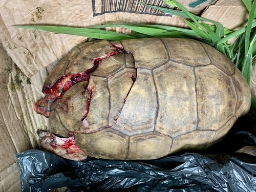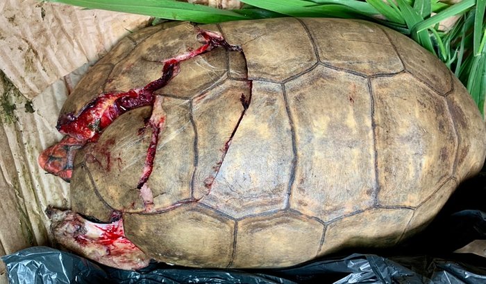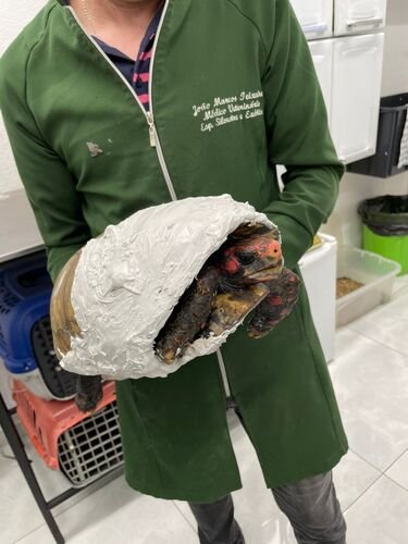 O jabuti precisou passar por um procedimento cirúrgico de emergência para a reconstituição de sua carapaça. Graças à competência do profissional e ao cuidado que recebeu, está se recuperando na clínica.