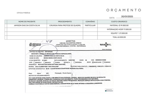 A única solução para recuperar minha qualidade de vida é a cirurgia para colocação de uma prótese no quadril. No entanto, o tempo de espera pelo procedimento pelo SUS ultrapassa seis anos, e eu não possuo convênio médico. A alternativa mais viável seria realizar a cirurgia de forma particular.