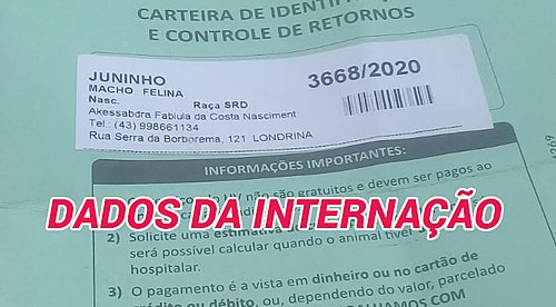 - Você pode levar o valor pessoalmente até a ao Hospital Universitário da UEL. Pergunte pelo gato Juninho registrado em nome de Alessandra Nascimento.