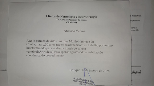Olá. Eu sou Murilo Henrique da Cunha, tenho 30 anos e sofro com uma condição de coluna chamada Artrodese. Preciso arrecadar R$ 44.000,00 para a realização da cirurgia e, em minha atual condição, não consigo trabalhar, dirigir e até mesmo preciso da ajuda de outros quando a coluna trava. Para voltar à vida normal, necessito angariar este dinheiro o mais rápido possível para o procedimento cirúrgico.