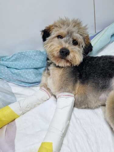 Estávamos em um sítio e o Zeca pulou de um muro de 4 metros e fraturou as duas patinhas :(