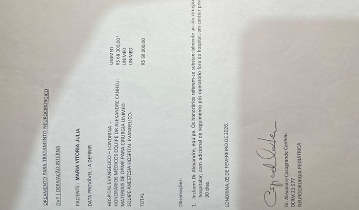 Essa cirurgia é essencial para que ela possa continuar crescendo com qualidade de vida, sem as dores e os riscos que a pressão intracraniana traz. Infelizmente, o custo do procedimento é de R$ 68.000,00 — um valor que, sozinhos, não temos como arcar com a pressa que o quadro dela exige.