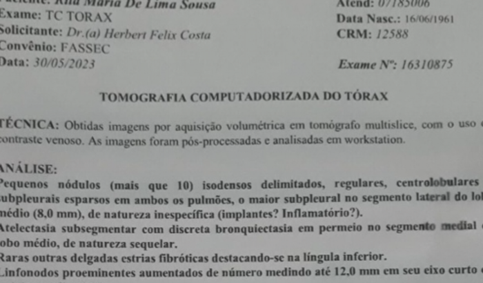 Peço ajuda para minha tia Rita poder realizar o procedimento cirúrgico que está marcado para o dia 05/08/2023, pois tenho 2 nódulos pulmonares que precisam ser retirados. Esse valor que estou pedindo, encarecidamente, é para realizar a compra dos equipamentos para a cirurgia, pois o plano de saúde não disponibiliza. Preciso urgente realizar essa cirurgia enquanto os nódulos estão pequenos e fico muito grata por achar esse meio virtual de me manifestar.