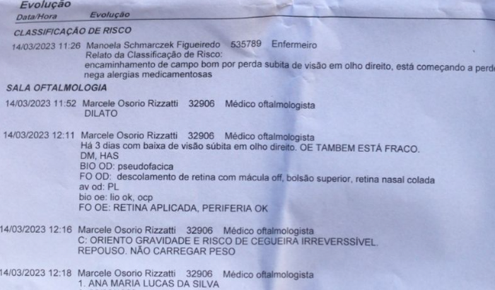 Minha mãe Ana Maria Lucas da Silva, de 53 anos, perdeu a visão do lado direito e está perdendo a do lado esquerdo, com os laudos do médico, ocorreu o descolamento da retina.