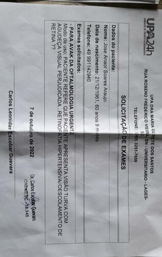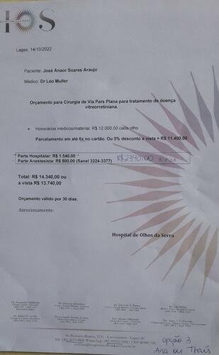 Preciso fazer com urgência uma cirurgia no olho esquerdo, devido um derrame interno que resultou na perda da visão por completo neste olho, e somente um procedimento conforme os laudos anexos e com urgência ou um MILAGRE será capaz de reverter este quadro. Faz 10 dias, e com consultas via SUS e Particular, o laudo e procedimento a ser feito, me foi hoje entregue por médicos Oftalmologistas como Dr. Mario Branco e família do Instituto Branco de oftalmologia e Hospital de Olhos da Serra pelo Dr. Oftalmologista Léo Muller.