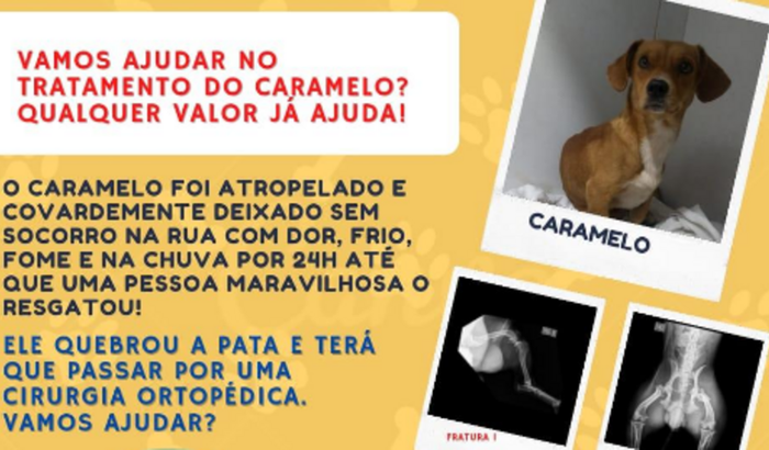 Ola, eu sou o Caramelo.Sou um animal de rua, fui atropelado e sofri uma fratura no fêmur e preciso passar por uma cirurgia urgente.