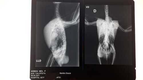 Segue abaixo imagem do raio x realizado na mesma onde o nódulo é essa bolinha localizada próxima ao local onde o rabo inicia.