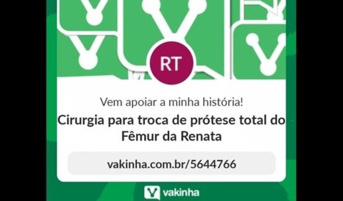 Meu nome é Renata Priscila Trindade e estou organizando esta vaquinha para reunir os recursos necessários à minha cirurgia de troca de prótese total do fêmur. Pra quem não sabe na infância eu tive um câncer no joelho, na cirurgia foi retirado um pedaço do osso e colocado uma prótese no local, em 2020 essa prótese quebrou e tive que fazer uma cirurgia onde foi retirado meu fêmur inteiro e colocado uma prótese total de fêmur e agora novamente essa prótese quebrou e preciso submeter pela terceira vez à cirurgia e troca da prótese