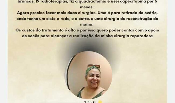 Sou Rosangela em 2021 recebi o diagnóstico de câncer de mama triplo negativo, fiz 16 quimioterapia: 4 vermelha e 12 brancas, 19 radioterapia, fiz a quadractomia e usei capecitabina por 6 meses. Agora preciso fazer mais 2 cirurgias 1 pra retirada do ovário onde tenho um cisto o-rads 2 e a cirurgia pra reconstrução da mama. Os custos do tratamento é alto e por isto quero poder contar com o apoio de vocês para alcançar a realização da minha cirurgia reparadora.